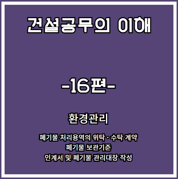 건설공무의 이해 16편은 환경관리에 대한 공부 정리이다. 안전관리 및 착, 준공 시 도급내역서에 '폐기물처리'와 '환경보전비'가 있다면 이것 역시 신경을 써야 되기 때문이다. 특히 폐기물 발생의 경우 폐기물 처리용역에 관련된 내용뿐만 아니라 '올바로 시스템'에 관련해서도 잘 숙지해둬야 한다.