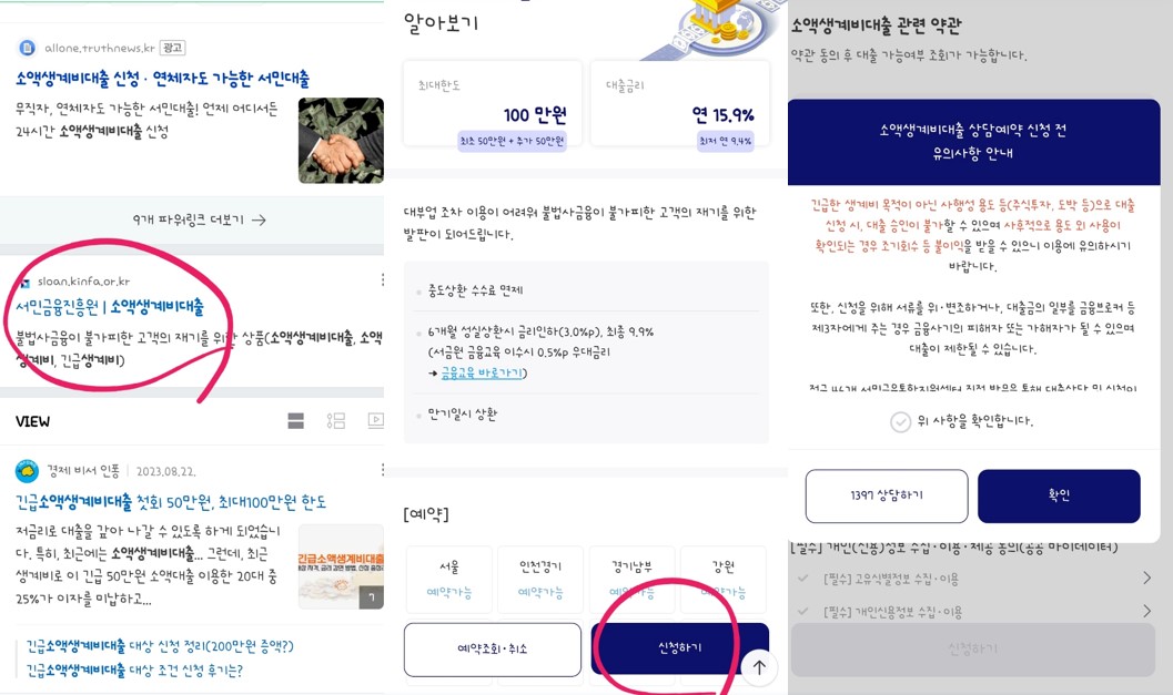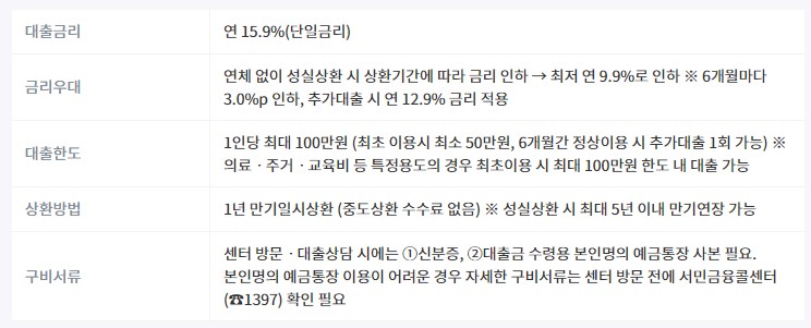 지속되는 금리인상과 그렇지 못한 월급, 그리고 이미 받았던 기존 대출들로 인하여 추가적인 소액 급전이 필요할 때 막막한 분들이 많으실 겁니다. 특히 이런 상황에 처해있는 분들은 대부분 저신용자에 해당되실 겁니다. 돈은 은행이나 대부에서 빌려야 한다는 고정관념으로 금리가 비싼 줄 알면서도 당장 생계에 지장이 생기어 방법을 찾기보다 눈에 보이는 쉬운 방법부터 찾아 결국에는 과도한 빚으로 악의 순환고리를 끊기 어려우실 거라고 생각합니다. 또한 과도한 빚으로 이미 대부업조차 이용이 어려워 불법사금융까지 생각하는 붙들고 계실 겁니다. 그런 분들을 위해 서민금융진흥원에서 소액생계대출이라는 상품을 내놓았습니다. 최대한도는 100만 원에 연 15.9%라는 금리로 나온 상품으로 절대 적은 금리는 아니지만 교육 및 성실상환 조건으로 최대 9.4%라는 이율까지 적용하여 사용가능하니 알아보심이 좋겠습니다. 보다 자세히 알려드리자면 아래 표를 참고해 주시면 됩니다. 불법사금융에서 일수로 이자를 납입하여 더 큰 빚이 생기는 것보다는 조금 높더라도 인증된 기관에서 받는 것이 악의 순환고리에서 조금 벗어날 수 있는 방법이 아닐까 생각합니다.