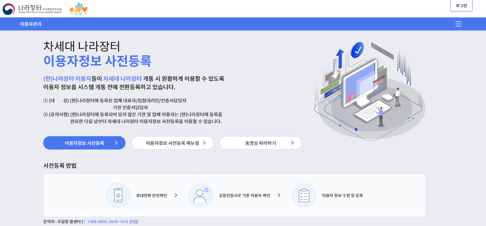 때문에 나라장터에서는 차세대 나라장터 이용자관리체계에 맞게 이용자정보를 사전등록요청을 하고 있다.