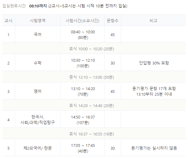 가 되겠습니다. 수험생 여러분은 그동안의 고생이 물거품이 되지 않도록 금지품목에 대해서는 철저히 지켜주심이 필요합니다. 휴대가능 품목은 신분증, 수험표, 컴퓨터용 사인펜, 흰색 수정테이프, 연필, 지우개, 샤프심, 아날로그시계, 마스크가 있겠습니다. 아래는 시간표입니다.